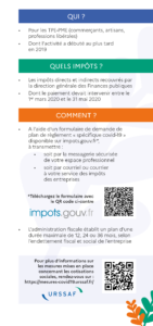 Vous trouverez ci-après un kit de communication (affiche + flyer) de la Direction générale des Finances publiques relatif au plan de règlement spécifique pour les dettes fiscales dans le cadre des mesures de soutien aux TPE et PME suite à la crise sanitaire.