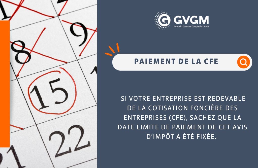 La date limite de paiement de l’avis d’impôt de CFE est fixée au 15 décembre 2023. Votre avis d’impôt est consultable en ligne.