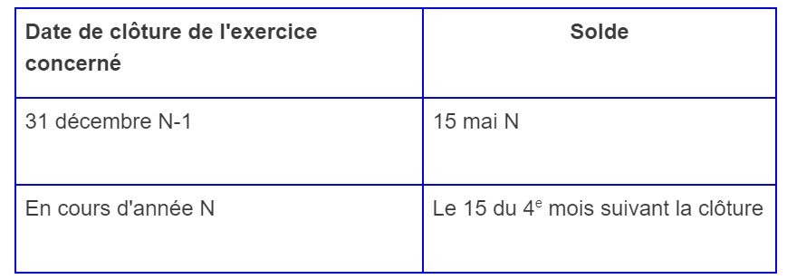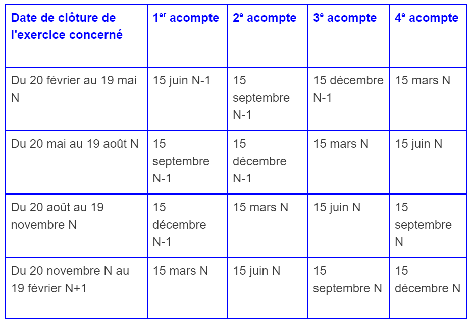 Chaque paiement d’acompte est effectué à date fixe : 15 mars, 15 juin, 15 septembre et 15 décembre. Les dates limites de paiement dépendent de la date de clôture de l’exercice de la société.