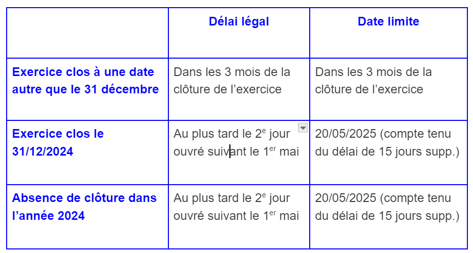 La déclaration de résultat doit être souscrite, en principe, dans les 3 mois de la clôture de l’exercice. Toutefois, si l’exercice est clos le 31 décembre ou si aucun exercice ne l’est au cours d’une année, la déclaration est réalisée au plus tard le 2e jour ouvré suivant le 1er mai.
